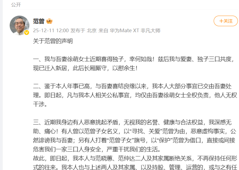 此前,据澎湃新闻,12月11日,画家范曾在北京参加活动,并捐赠字画。这是他自8月“失联风波”后首度公开露面。会后,范曾先生接受澎湃新闻专访,独家回应近况,其称“最近生了独子,搬了新家,是一个非常愉快、非常幸福的家庭。”