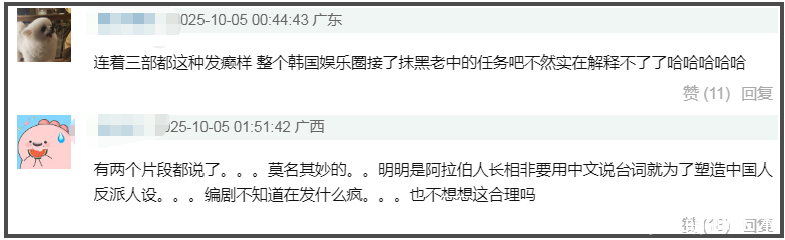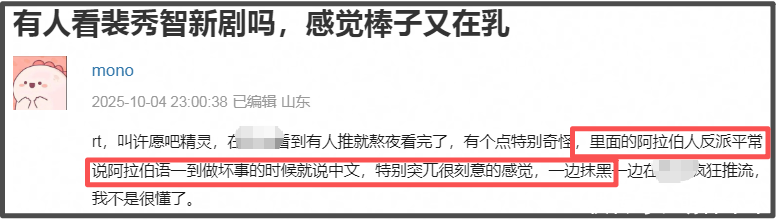 据悉,《许愿吧精灵》是外网网飞独播剧集,没有在中国平台播出,但其在中国的营销不亚于同步播出的中剧,许多网友因为推流的原因被吸引观看,结果发现剧中出现了大量的辱华情节,而且极其突兀。该剧主要语言是韩语和阿拉伯语,但剧中的反派阿拉伯人只要一干坏事就突然说中文,非常刻意且不怀好意。
