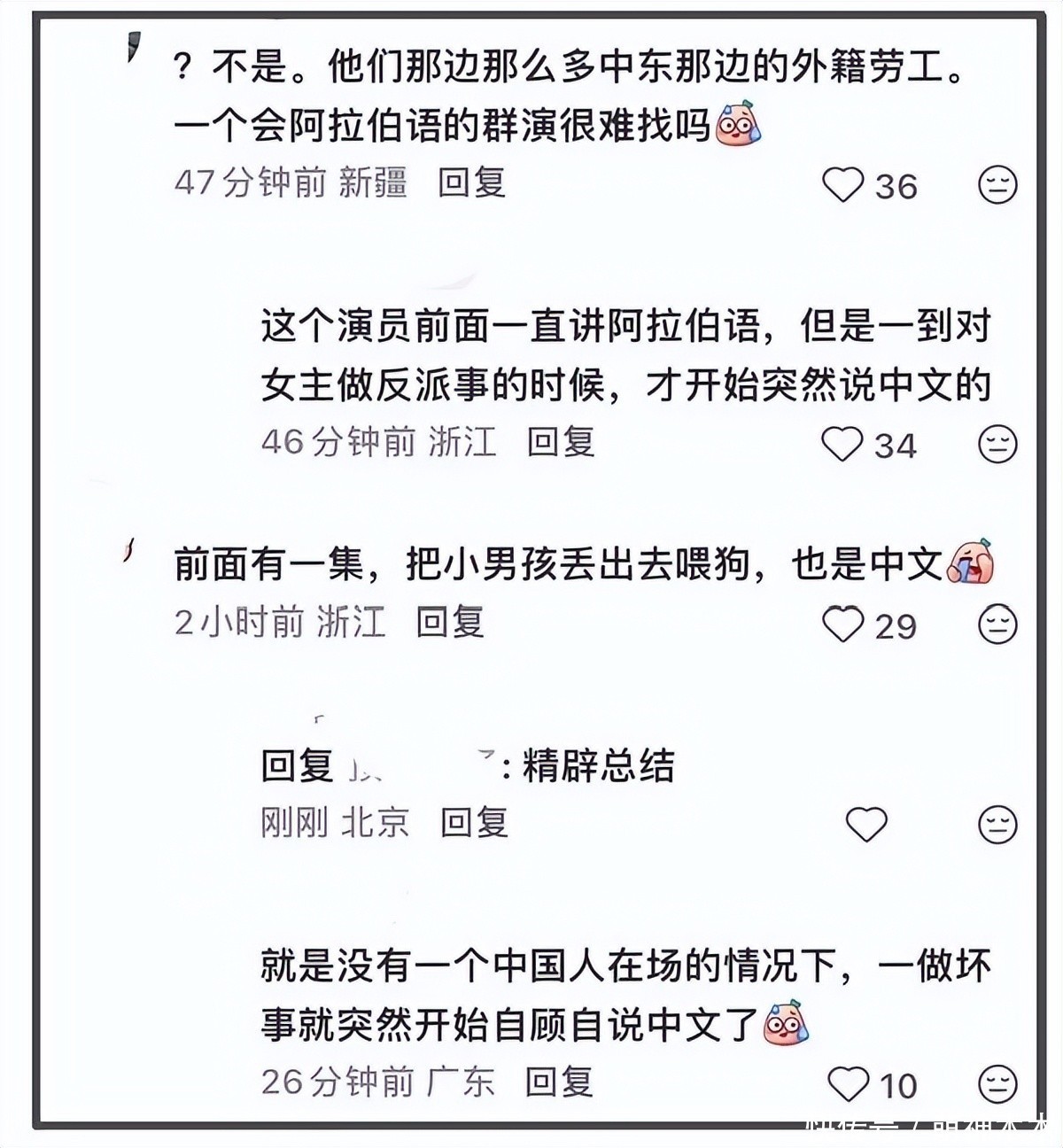 该剧剧情与中国人无关,且不具备中国背景,但偏偏干坏事的人要说中文,很难说它不是故意抹黑中国形象。而且,几乎都是阿拉伯反派对女主做坏事的时候,不限于用中文说要把女主买来喂畜牲等剧情,以及把小男孩丢出去喂狗等等。